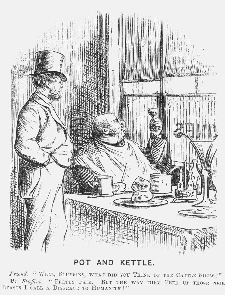 'Pot and Kettle', 1868. Modern farming methods were now being developed in order to provide more produce for a growing population. Here, a stout gentleman inspects the wine, and prepares to enjoy a hearty meal, but reports his concerns about the force-feeding of livestock. From Punch, or the London Charivari, December 1868.