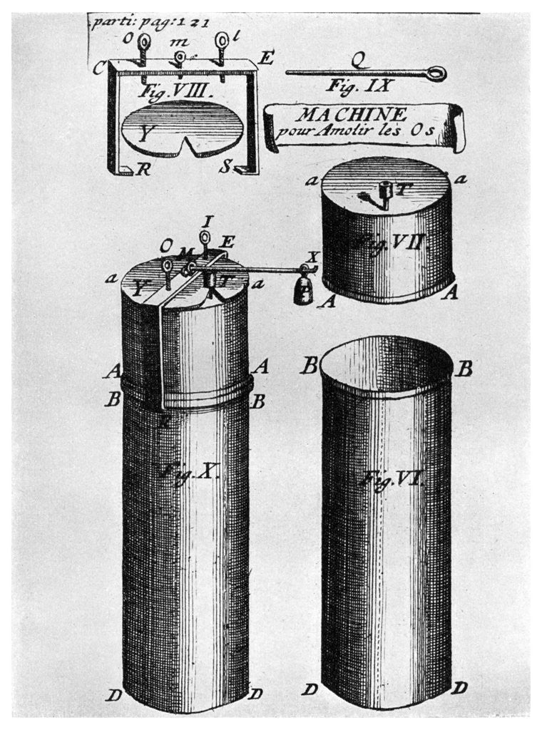 Pressure cooker, 1688 (1956). From Denis Papin's La maniere d' amolir les os. A print from Things, a volume about the origin and early history of many things, common and less common, essential and inessential, by Readers Union, the Grosvenor Press, London, 1956.
