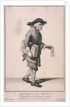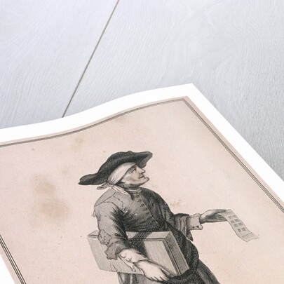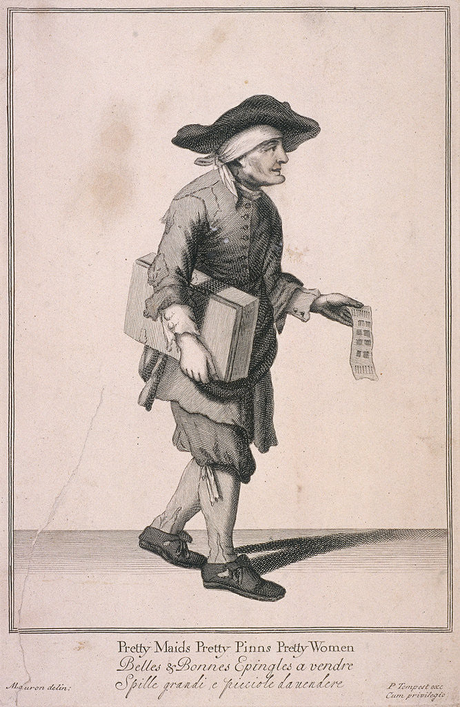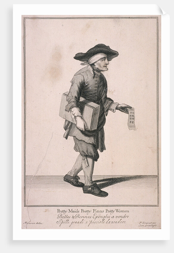'Pretty Maids Pretty Pinns Pretty Women'. A street seller, carrying a box under his arm. From Cries of London, (c1688?).