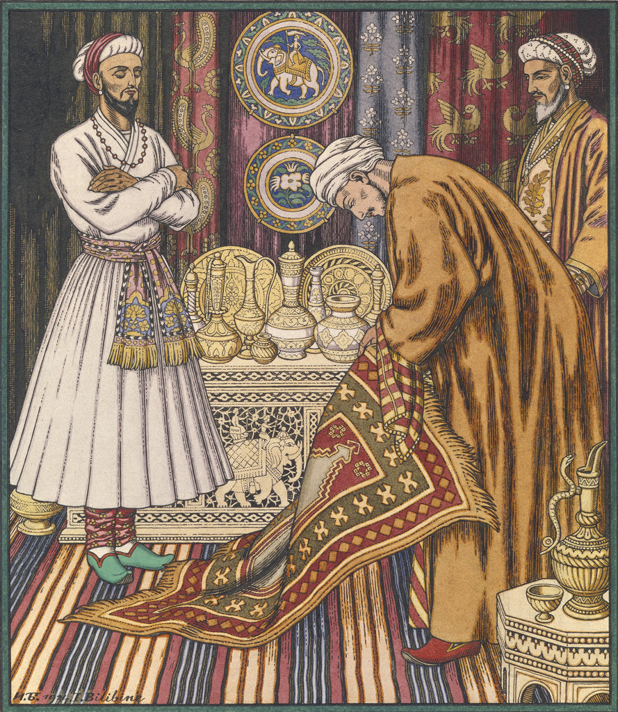 Prince Ali buying a carpet. Illustration for Arabian Fairy Tales. Found in the collection of the State Russian Museum, St. Petersburg.