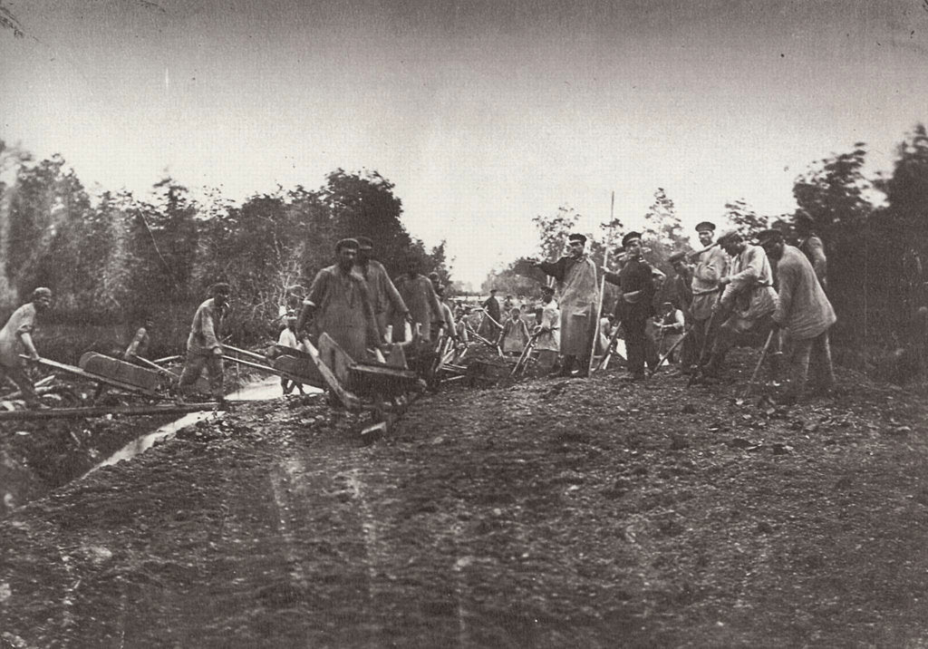 Prisoners at work, Sakhalin, Russia, 1890s. A large island off the Pacific coast of Siberia, Sakhalin became the site of prison labour camps known as katorga from 1857. In 1891 Russian author Anton Chekhov visited Sakhalin and wrote about the conditions in the camps in his book Sakhalin Island. Found in the collection of the Institut of Russian Literature IRLI (Pushkin-House).