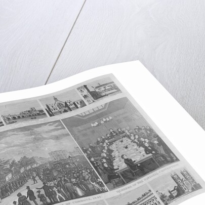 Procession attending the great National Petition of 3,317,702 to the House of Commons, 1842. With engravings of T Duncombe presenting the petition and Members of the National Convention. Surrounded by a border containing views of buildings and incidents in connection with the same.