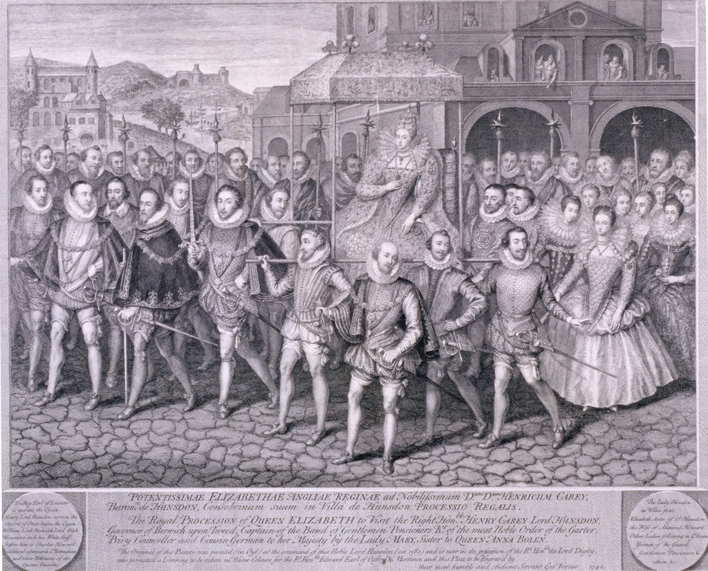 Procession of Queen Elizabeth I to Blackfriars, London, 16 June 1600, (1742). The queen is being carried by her armed guard and flanked by her courtiers. Spectators are watching the procession from balconies.