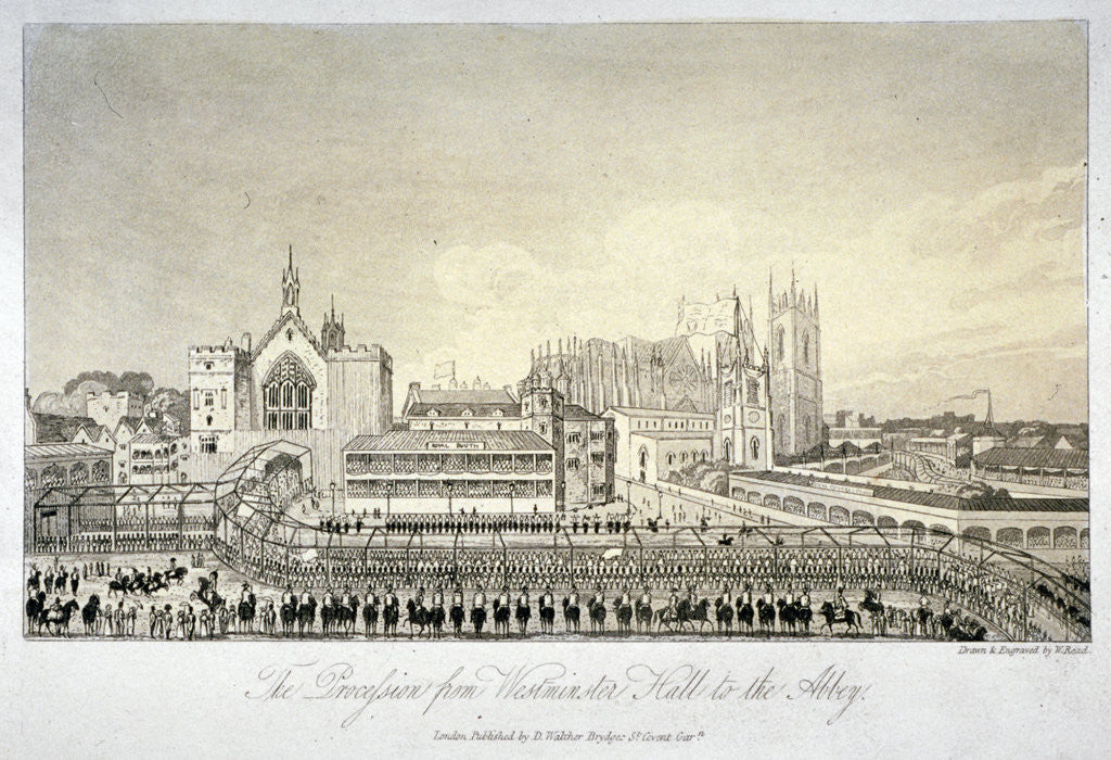 Procession outside Westminster Hall, London, 1821. The procession from Westminster Hall to the Abbey on the occasion of King George IV's coronation, 19 July 1821.
