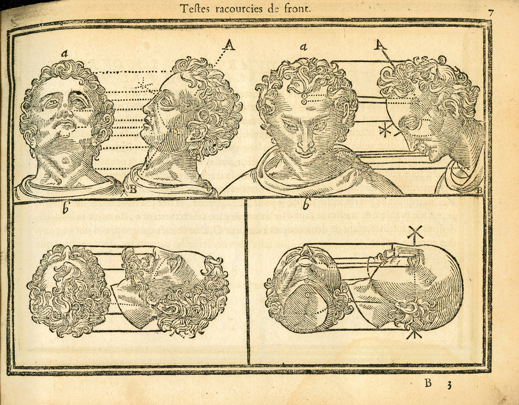 This diagram illustrates the proportions of the human head using different angles and rotations of the head. Plate 3 from La Vraye Science de la Pourtraicture Descrite & DemonstrÚe by Jean Cousin (Paris, Francois Demasso, 1663). Inscribed: 'Tetes racourcies de front. 7.'