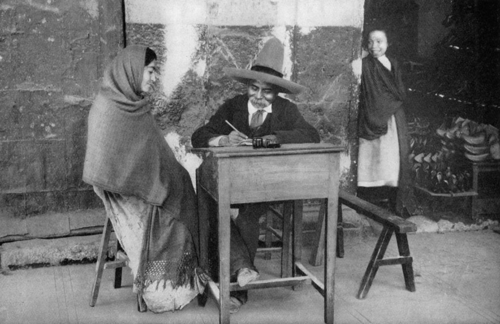 Public letter writer, Mexico. Public letter writers earned a living writing letters on behalf of people who were illiterate. A print from Customs of the World, Volume II Hutchinson and Co, Paternoster Row, London.