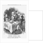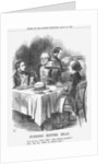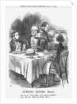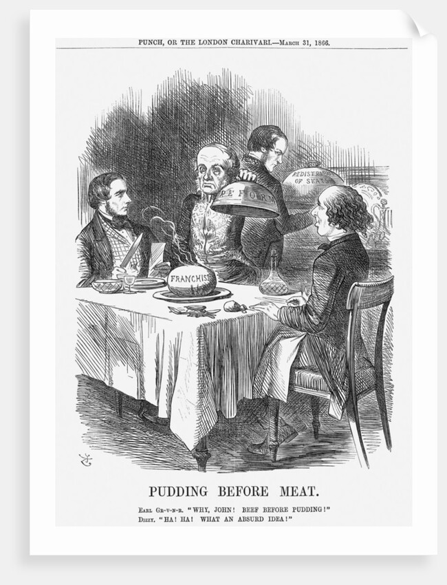 'Pudding before Meat', 1866. Earl Gr-v-n-r exclaims Why, John! Beef before Pudding! Dizzy adds Ha! Ha! What an Absurd Idea! Lord Russell lifts the lid on the meat dish, with 'butler' Gladstone at the rear bringing in the covered dish of redistribution. The Conservative, Disraeli, who had long been a supporter of parliamentary reform, is seated at the right of the picture. Lord Russell, the Liberal Prime Minister, had recently introduced a bill for parliamentary reform. However, he was met with opposition from his own party, chiefly in the form of attacks by Mr Robert Lowe who objected strongly to placing more power in the hands of the lower classes. Further Liberal objections concerned the separation of 'Franchise' and 'Redistribution'. Earl Grosvenor (on the left) felt that before the reduction of the franchise could be meaningfully debated, the House should have details of the scheme for the redistribution of seats. In debates on this bill, however, Disraeli spoke very powerfully against the government and, when it became clear that the government could not win this battle, the Russell administration resigned. From Punch, or the London Charivari, March 31, 1866.