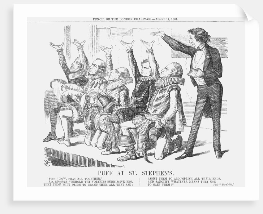 'Puff at St Stephen's', 1867. Disraeli, as producer, lines up his actors for the final scene. They are kneeling at the foot of the stage in Elizabethan dress. The theatre featured quite heavily in the Punch issue of 17th August 1867 and this is reflected in this cartoon. From Punch, or the London Charivari, August 17, 1867.