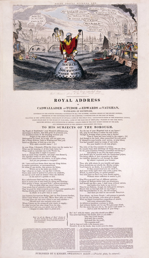 Satire on the purity of the water in the River Thames showing Cadwalla-der Tudor Edwards Vaughan, water king of Southwark, addressing subjects of his borough at low tide by London Bridge, with verse below.