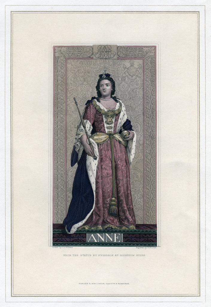 Queen Anne, (19th century). Portrait of the queen (1665-1714) in formal dress with ermine-lined cloak, orb and sceptre. Hand-coloured later.