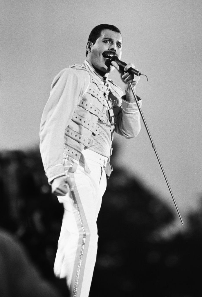 Rock group Queen in concert at Knebworth pop festival. Lead singer Freddie Mercury performing on stage. 9th August 1986.