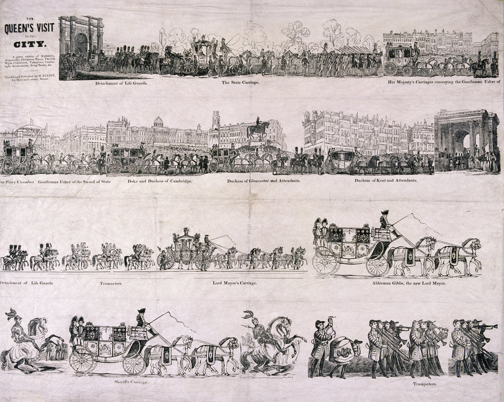 View of the royal procession for Queen Victoria's visit to the City to open the Royal Exchange, 28 October 1844, detailing prominent figures.