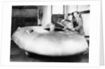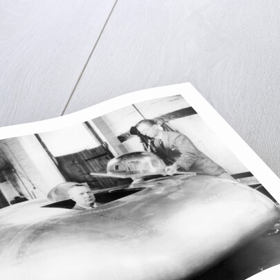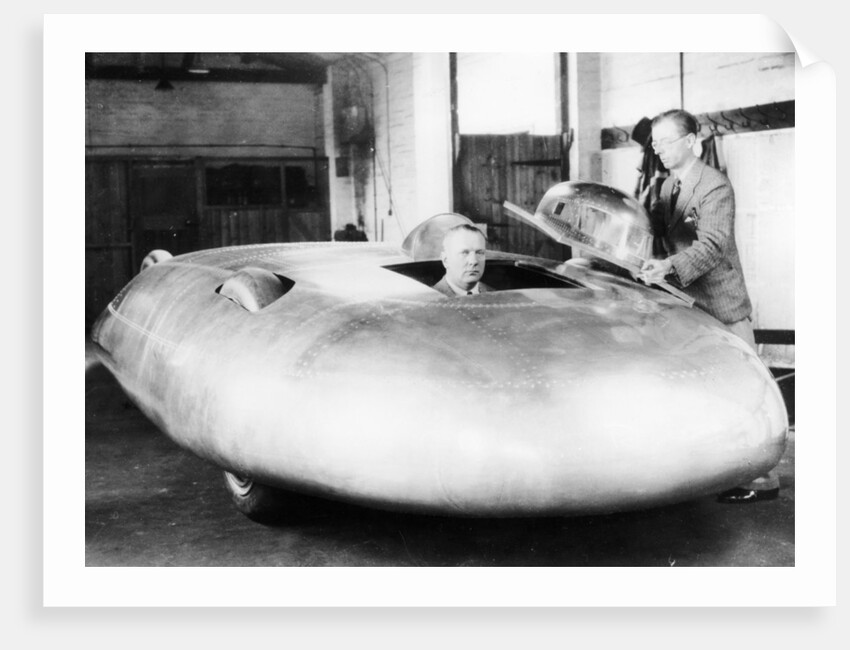 Railton Special Land Speed Record car, Brooklands, Surrey, 1938. John Cobb is pictured in the car with its designer, Reid Railton, standing alongside holding the cockpit canopy. Cobb set Land Speed Records in this car at Bonneville Salt Flats, Utah, USA. In 1947, when he set the record at 394.19 mph, on one of the required two runs he exceeded 400 mph, the first man to break this barrier. He was killed in 1952 when, attempting to break the water speed record, his boat disintegrated at high speed on Loch Ness.