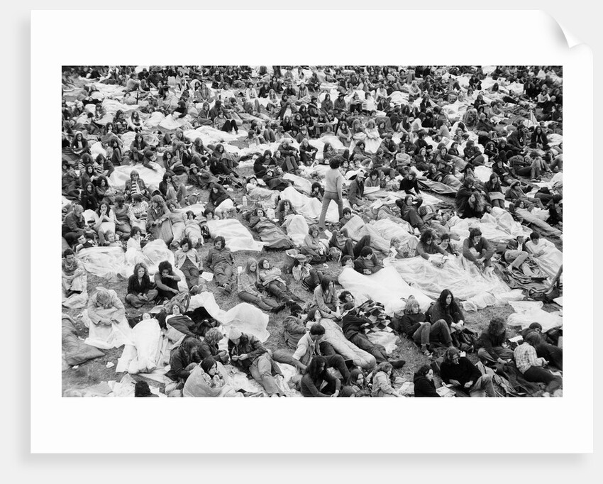 Reading Pop Festival. A group of fans listening to a group on stage at the main stage, with their plastic sheets ready to protect them from the rain. 26th June 1971.