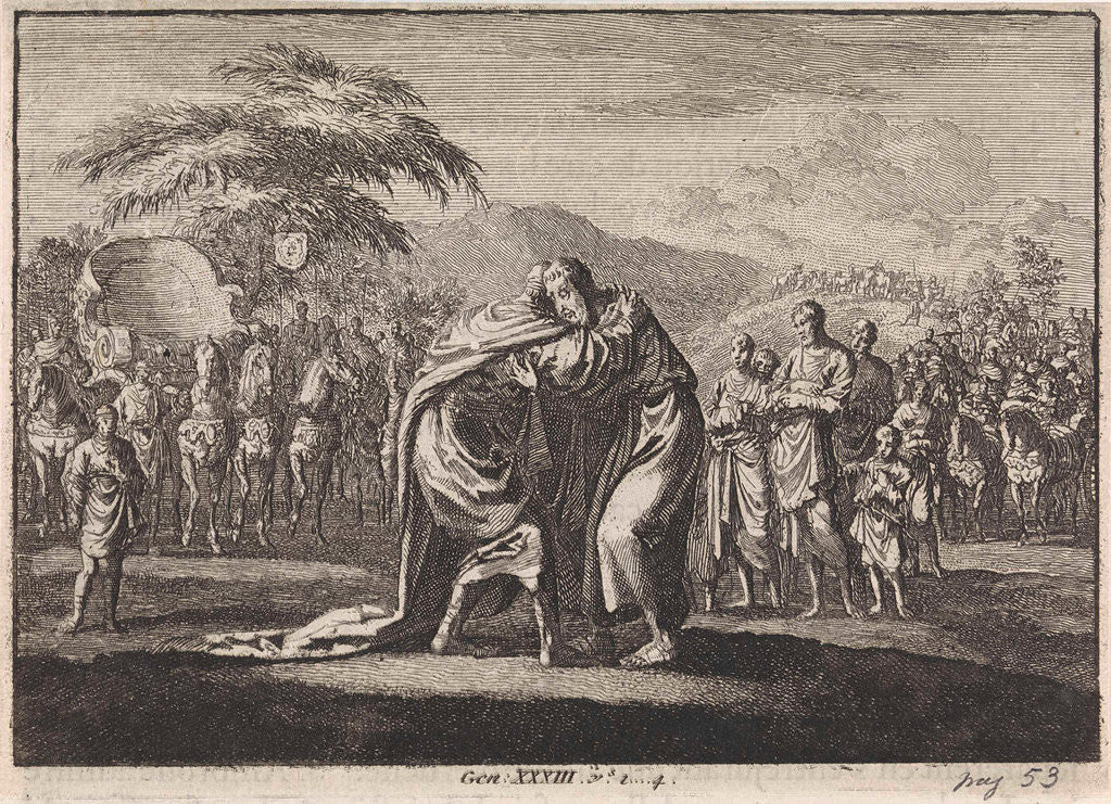 Reconciliation of Jacob and Esau, Jan Luyken, Pieter Mortier, 1703 - 1762