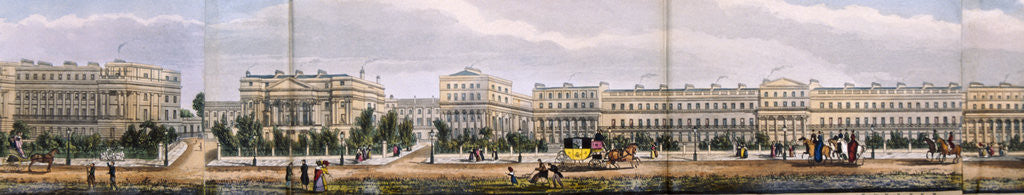 Panoramic view of the area around Regent's Park, London, 1831; showing Cumberland Villas and part of Chester Terrace, with figures in the foreground, including a man being pushed along in a bath chair, also with horses and carraiges.