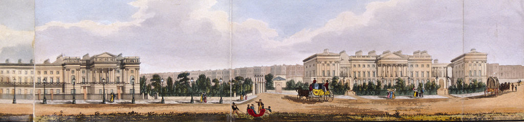 Panoramic view of the area around Regent's Park, London, 1831; showing Clarence Terrace, with figures, horses and carriages in the foreground.