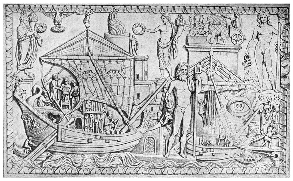Relief showing the Roman lighthouse at Ostia, port of Rome, Italy, 1956. A print from Things, a volume about the origin and early history of many things, common and less common, essential and inessential, by Readers Union, the Grosvenor Press, London, 1956.