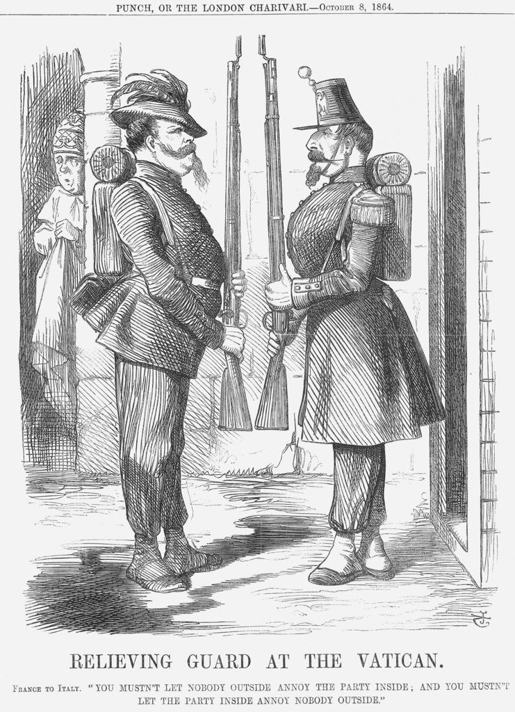 'Relieving Guard at The Vatican', 1864. France says to Italy: You mustn't let nobody outside annoy the Party inside; and you musn't let the Party inside annoy nobody Outside.' In mid-September 1864 a convention was concluded between France and Italy, under the terms of which Napoleon (shown on the right) agreed to withdraw French troops from the Papal States. Italy, in turn, agreed not to make any attack on the present territory of the Pope. Here, then, Pope Pius IX eavesdrops in the background, whilst France and Italy change guard. From Punch, or the London Charivari, October 8, 1864.