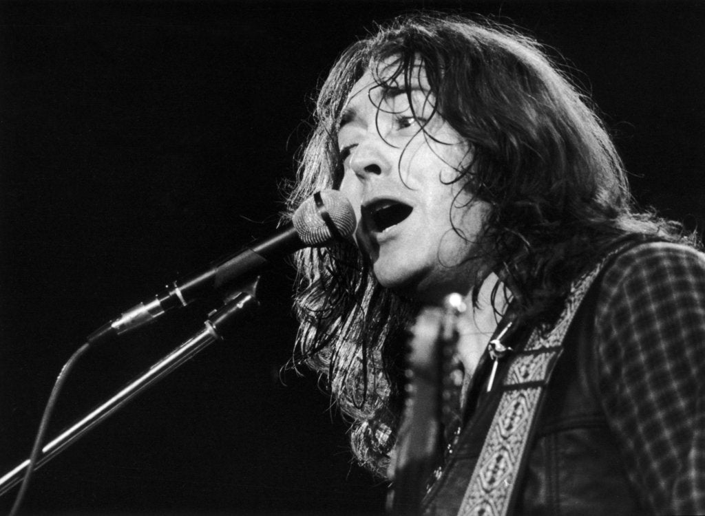 Irish blues rock musician and singer Rory Gallagher piuctured performing in concert during his tour of Europe. April 1982.