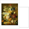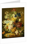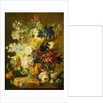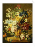 Product details Roses, Peonies, Tulips, Morning Glory, an Iris, Columbine, a Poppy, Jonquils and Other Flowers in a Carved Urn on a Stone Ledge