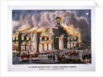 A view of the Royal Exchange, London, engulfed by fire in 1838. In the foreground a horse drawn fire engine rushes to the disaster and firemen direct jets of water towards the fire.