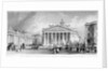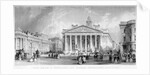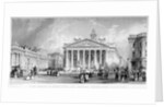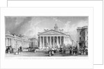 View of Royal Exchange and the Bank of England on left, with figures, horses, carriages and omnibuses in the street.