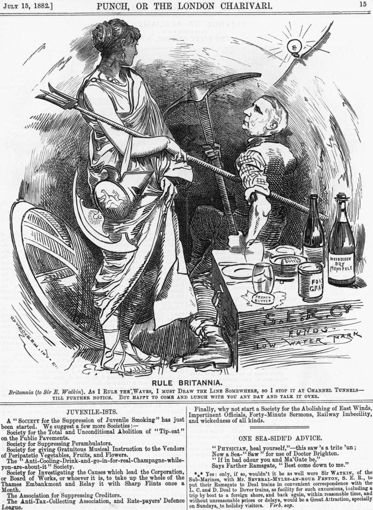 'Rule Britannia', 1882. Britannia is not sure whether or not she has jurisdiction over the proposed Channel Tunnel. From Punch, or the London Charivari, July 15, 1882.