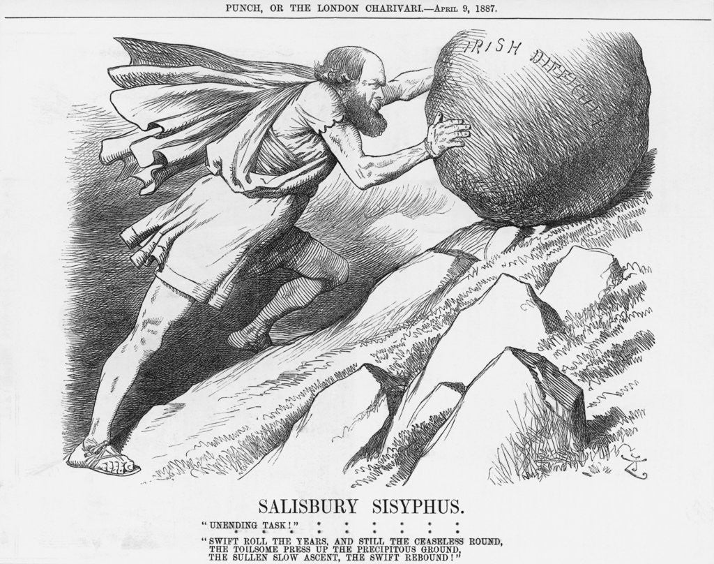 'Salisbury Sisyphus', 1887. Lord Salisbury, the Conservative Prime Minister, pushes the boulder of Irish Difficulty up a steep slope. The Irish Land Bill had just been introduced in the Upper House by the Earl of Cadogan. The problems in Ireland had brought down governments in the past, and the newly resurrected questions of Reform and Redress now faced the latest Prime Minister. From Punch, or the London Charivari, April 9, 1887.