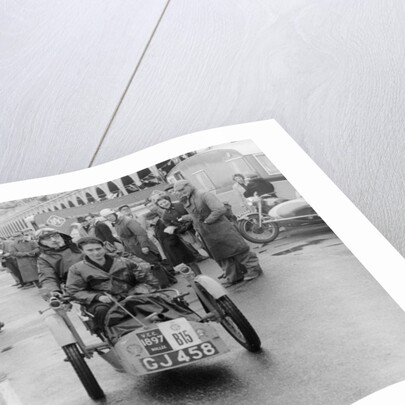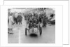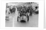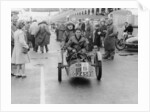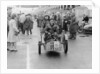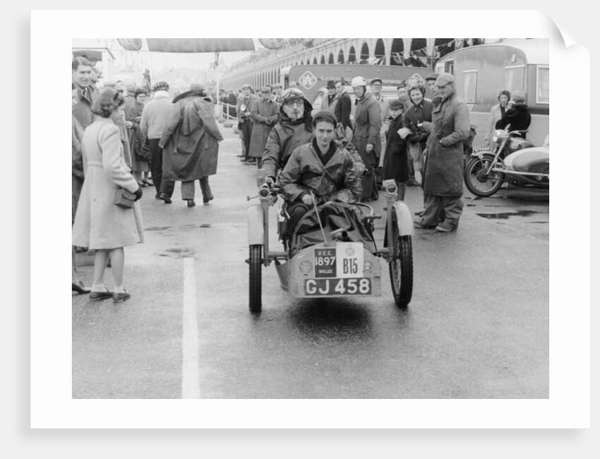 Sammy Davis with 1897 Leon Bollee tricar 'Beelzebub', London to Brighton Run. Davis and his vehicle pictured in Brighton at the finish of the event, watched by groups of onlookers.