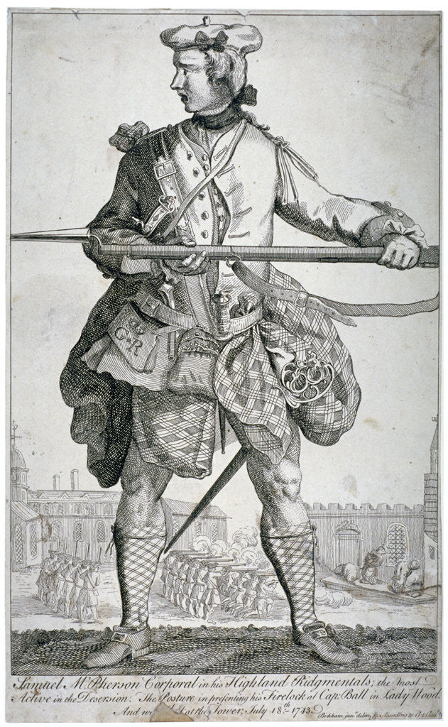 Samuel McPherson, Scottish soldier, 1743. 'Samuel McPherson, corporal, in his highland ridgmentals [sic], the most active in the desersion [sic]. The posture in presenting his firelock at Capt Ball in Lady Wood, and was shot at the Tower, July 18 1743'. McPherson was a soldier in the Black Watch (Royal Highland Regiment). Having been ordered to London, some of the regimant's soldiers deserted after hearing a rumour that they were to be shipped out to America. McPherson was one of three men executed for the desertion.