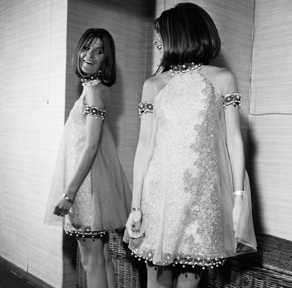 Sandie Shaw, leaves for Vienna tomorrow, to compete in the Eurovision Song Contest, on Saturday, and this is the dress she will wear when she sings Britain's entry "Puppet on a Strng". The pink dress consists of a beaded underdress and a chiffon overdress, by Parker Costumier Ltd, Horse and Dolphin Yard, Macclesfield Street, W1, London, April 1967.