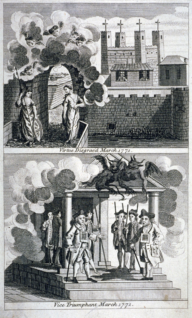 Satire, 1771. A satire relating to the imprisonment in the Tower of London of the Lord Mayor, Brass Crosby, and Alderman Oliver, titled 'Virtue disgraced' and 'Vice Triumphant'. Crosby and Oliver clashed with Parliament over the publication of parliamentary debates.