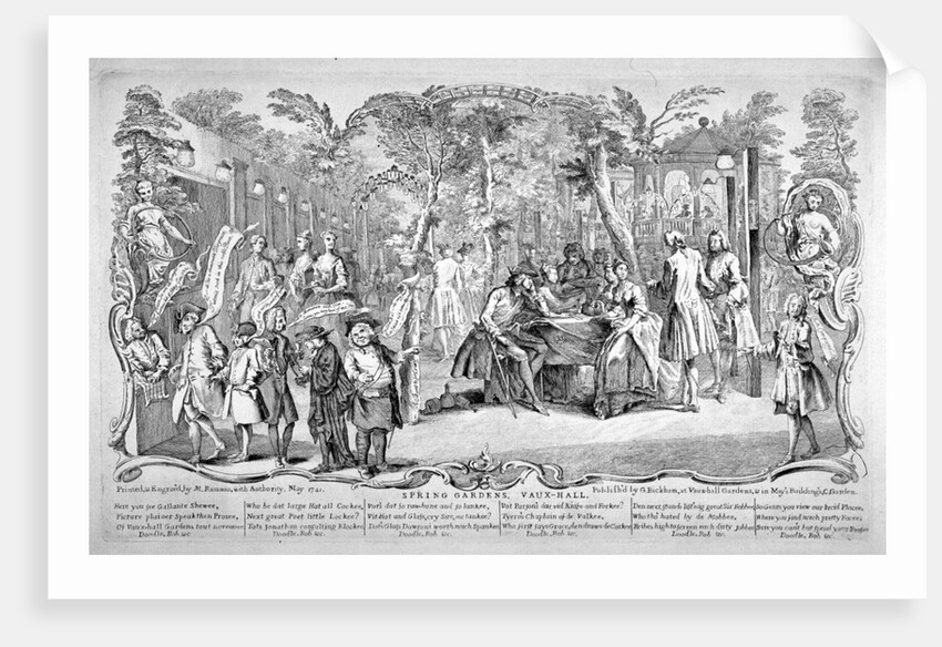 Scene at Spring Gardens, Vauxhall, London, 1741. On the left a group of figures stand with speech bubbles appearing from thier mouths. In the centre a seated man gazes across the table at a woman while their companions eat and drink. The lower margin contains a verse.