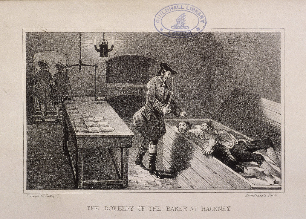 Scene of the robbery of a baker at Hackney, London, c1730. A soldier holding a sword discovers two men hiding in a long chest. Two other soldiers guard the door. Bread and some scales are on the table in the dimly lit room.