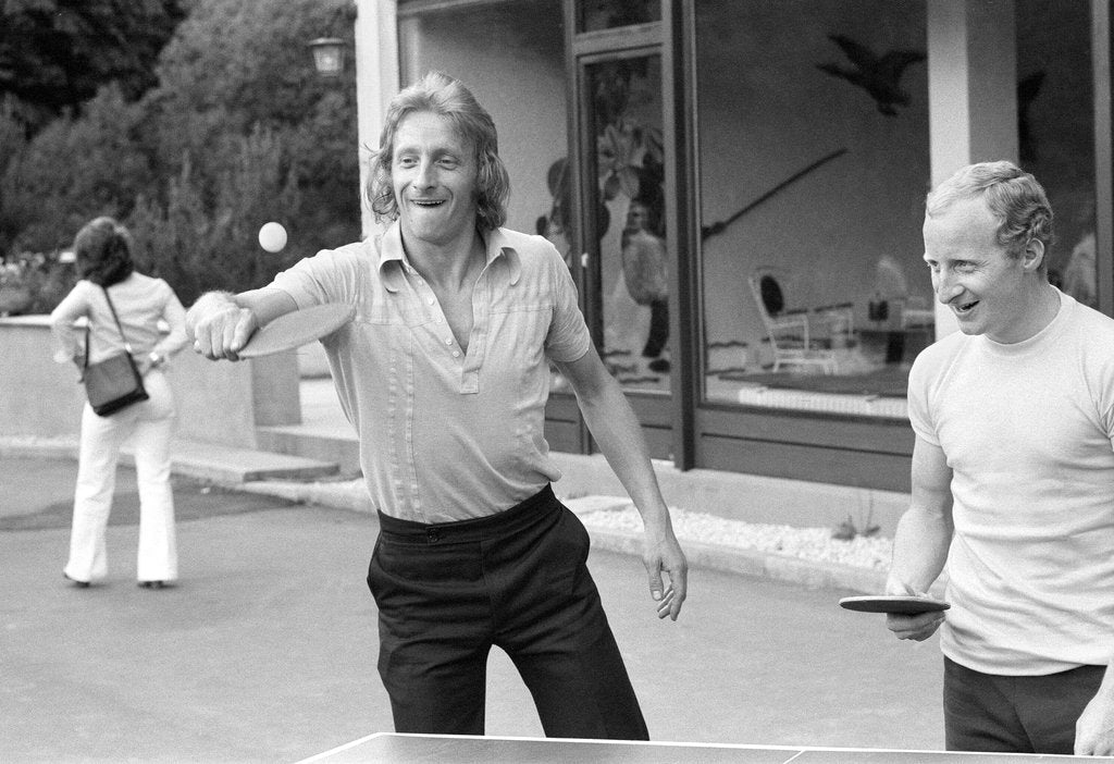 1974 World Cup tournament in West Germany. The Scotland football team relaxing at their Weilnau Hotel in Frankfurt. Denis Law and Jimmy Johnstone enjoying a game of table tennis in the hotel grounds. 17th June 1974.