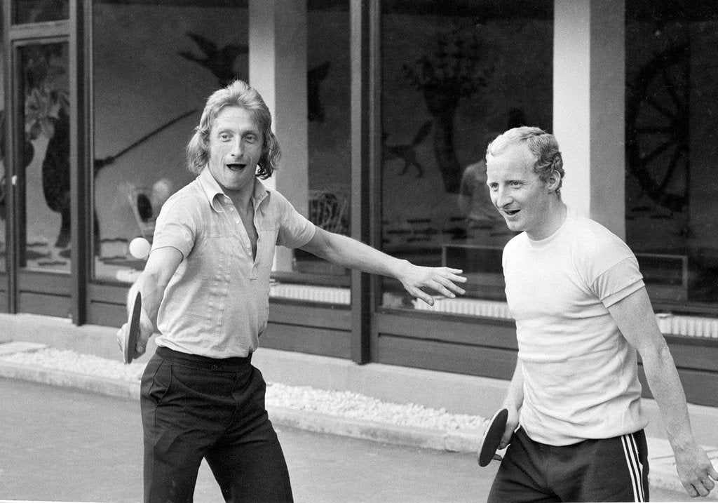 1974 World Cup tournament in West Germany. The Scotland football team relaxing at their Weilnau Hotel in Frankfurt. Denis Law and Jimmy Johnstone enjoying a game of table tennis in the hotel grounds. 17th June 1974.