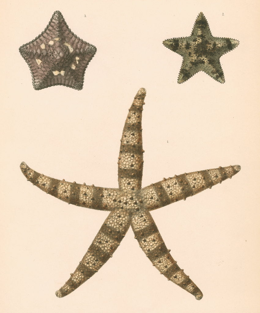 Marine zoological studies of three sea stars, or starfish.