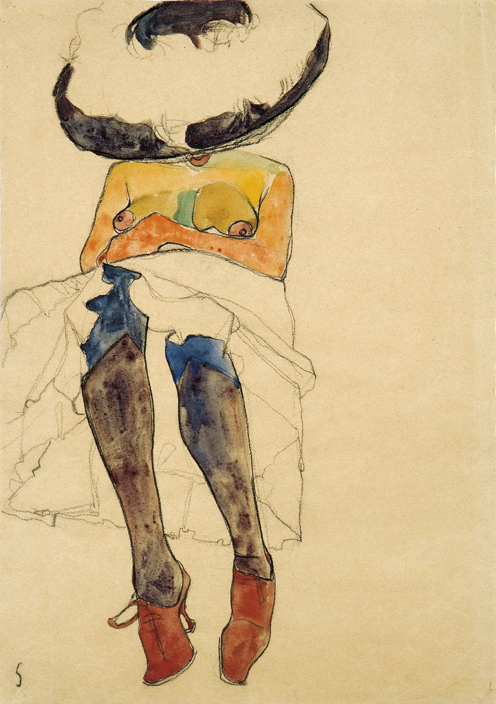 Seated semi-nude with hat and purple stockings, 1910. Private Collection.