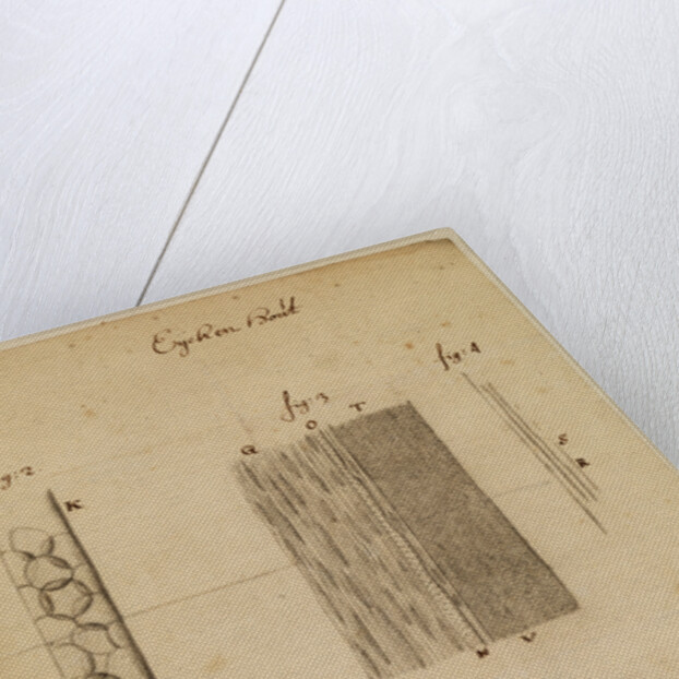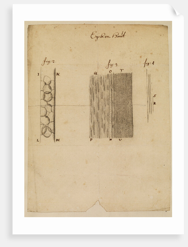 Illustrations accompanying a letter describing Antoni van Leeuwenhoek's microscopical observations, dated 12 January 1680. An English extract of the letter was printed in Philosophical Transactions of the Royal Society, vol 13 (1683), pp. 197-208. The figures show microscopic views of the fibres in a section of oak.