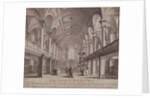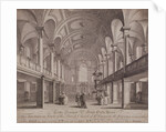 Sectional view of St Giles in the Fields, Holborn, London, 1753. Figures dressed in fashionable and professional costume, walk within the interior of the church. Below there is text relating to the image.