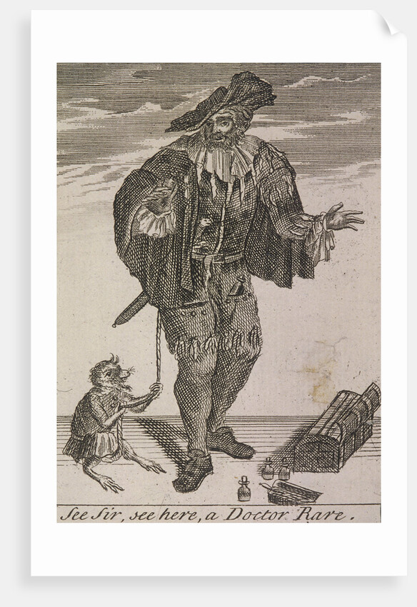 'See Sir, see here, a Doctor Rare', (c1688?). A quack 'doctor' accompanied by a monkey. His case and a number of small bottles are on the ground. From Cries of London, (c1688?).