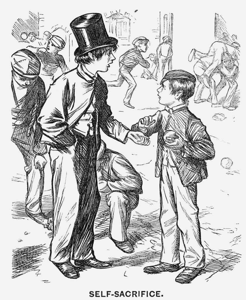 'Self-Sacrifice', 1866. Tom tries to convince his young cousin Reginald to let him squeeze the nasty juice from his unwholesome orange, as he wants the orange himself. From Punch, or the London Charivari, April 7, 1866.