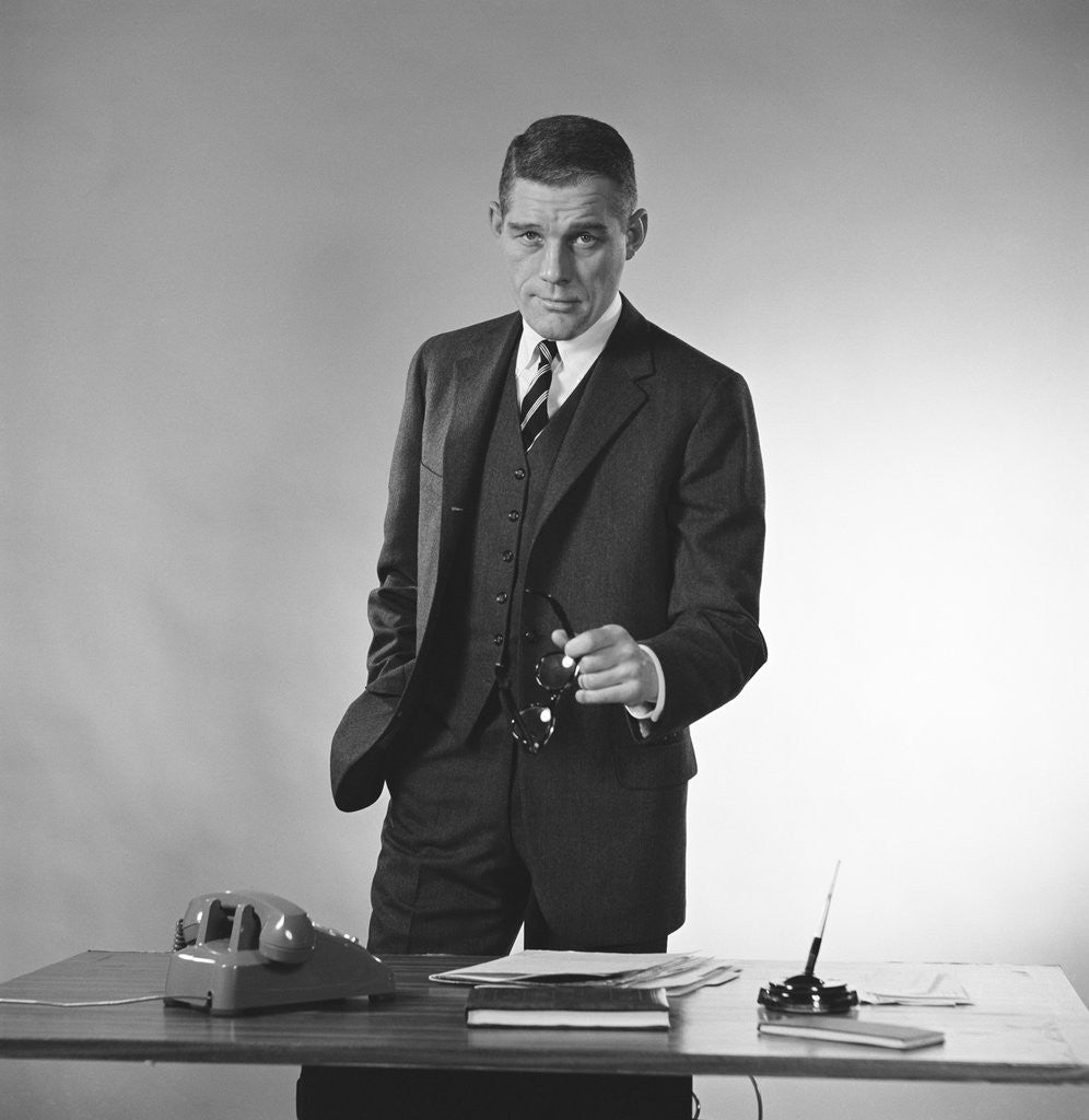 Product details Serious businessman three piece suit standing behind desk gesturing with glasses