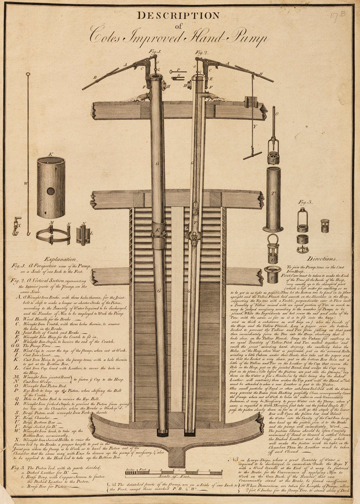 William Cole's deign for an improved ships chain pump. Sectional elevation, 1:24 scale. From Smeaton volume 2, fol. 117. A patent (no. 911) was granted to William Cole on 16 December 1768 for chain pumps for raising water out of ships and other purposes.