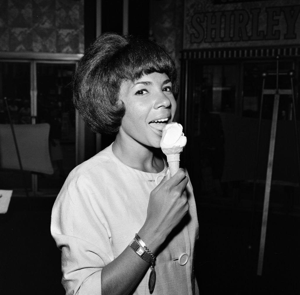 Shirley Bassey opens a new season tomorrow at the Talk of the Town. She is the first artist to be invited back to the West End night spot three times. Shirley eating an ice cream during a break in rehearsals. 30th May 1964.