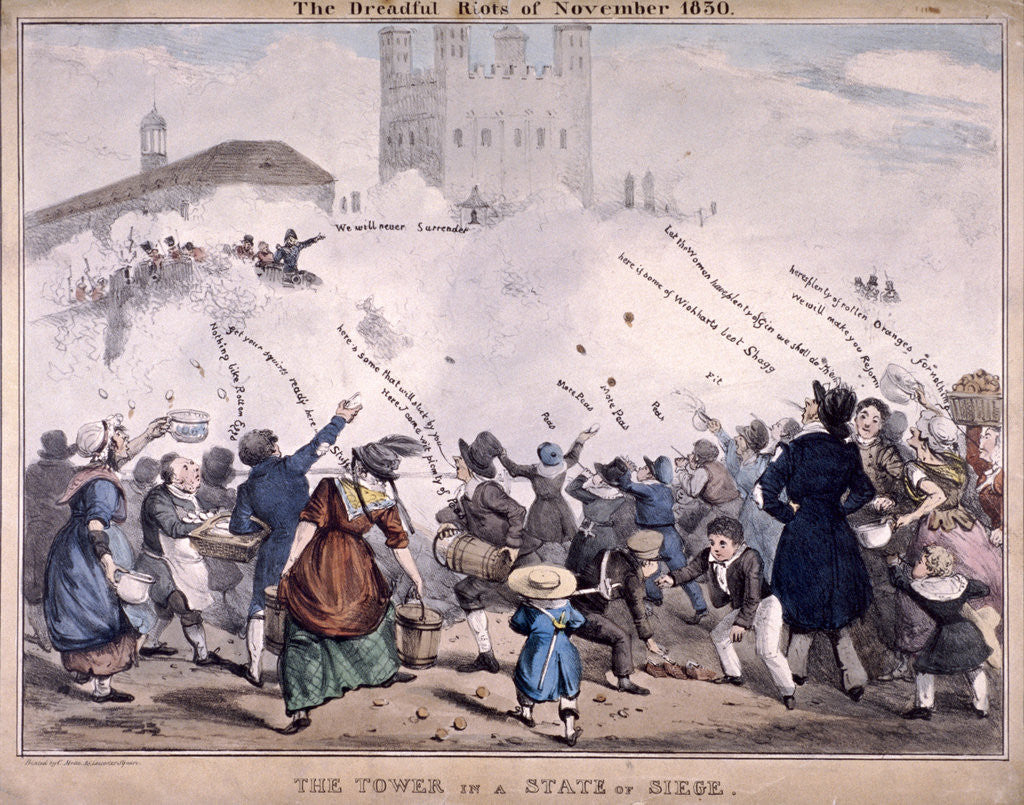 Tower of London under siege during the riots of November 1830. A mob of men, women and children armed with pea shooters, bad eggs, rotten fruit and kitchen and bedroom slops are attacking the Tower, which appears out of a cloud of smoke. Riots on a huge scale were expected on Lord Mayor's Day 1830 but did not develop.