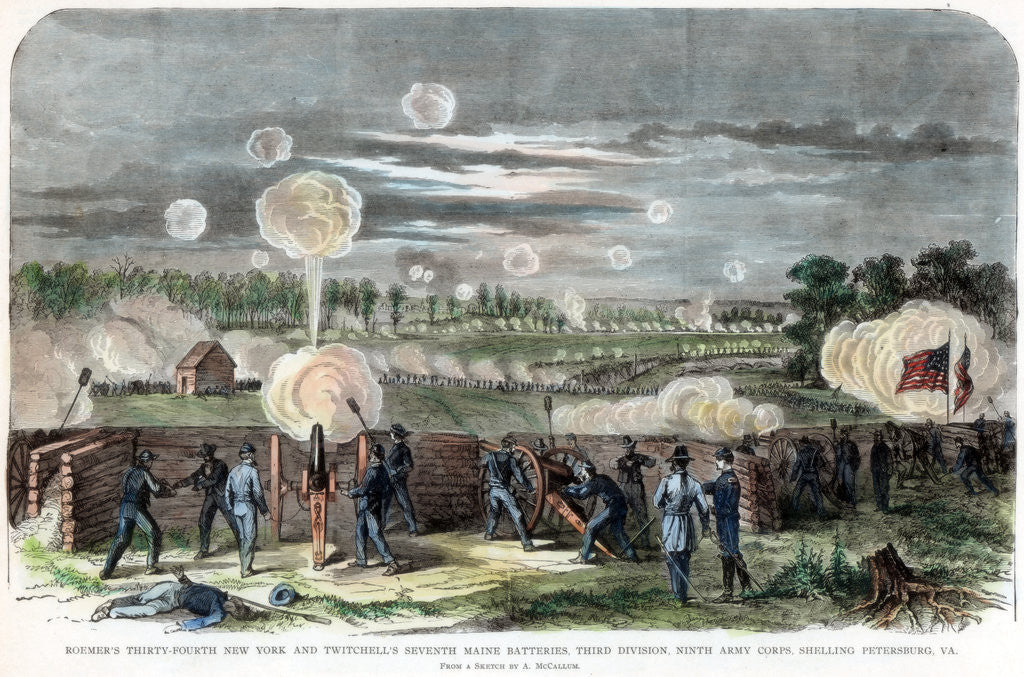 Siege of Petersburg, Virginia, American Civil War, c1864-c1865. Union artillery of Roemer's 34th New York and Twitchell's 7th Maine batteries, 3rd division, 9th Army Corps bombarding the Confederate-held city's defences. The Siege of Petersburg, which lasted from June 1864 until March 1865, foreshadowed the trench warfare battles of World War I.