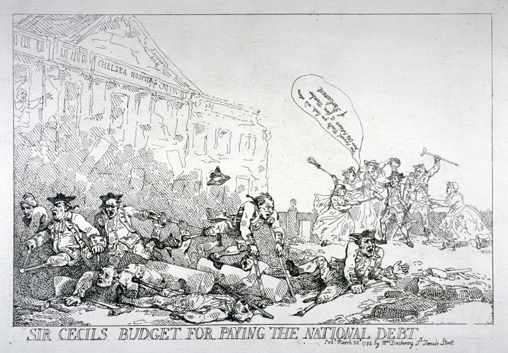 'Sir Cecils budget for paying the national debt', 1874. Chelsea Hospital falling into ruins, whilst pensioners are fleeing. In the distance Sir Cecil Wray is being mobbed by a group of maid-servants and a pensioner.