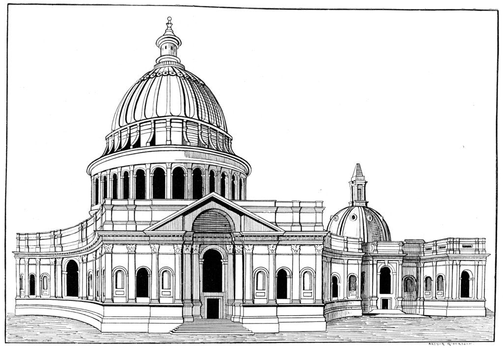 Sir Christopher Wren's original model for St Paul's cathedral, London, c1670-1672 (1893). Wren was commissioned to design the replacement for the cathedral destroyed in the Great Fire of London. Construction began in 1677 and was completed on Wren's 76th birthday, 20th October 1708. An illustration from A Short History of the English People, by J R Green, illustrated edition, Volume III, Macmillan and Co, London, New York, 1893.